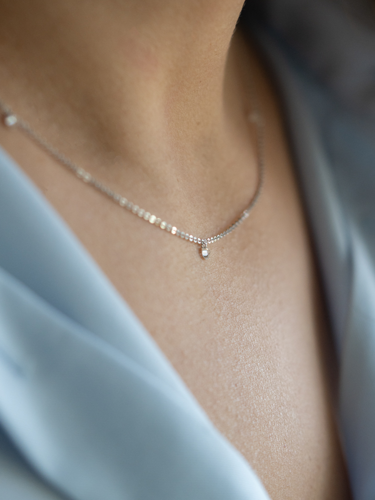 Ovaj tip ogrlice spaja tišinu minimalizma sa snagom dijamantskog sjaja, zbog čega je postao jedan od najpoželjnijih stilova savremenog nakita. Diskretan ali upečatljiv, suptilan ali luksuzan. Savršen za ženu koja voli autentičnu eleganciju.