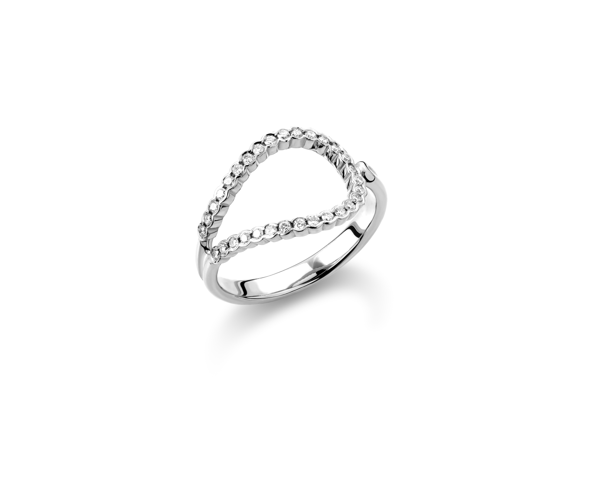 Predivan dijamantski prsten oblikom podseća na talas. To ga čini originalnim i nesvakidašnjim komadom nakita kojim ćete iznenaditi i očarati svaku damu koja pleni svojim stilom i elegancijom.