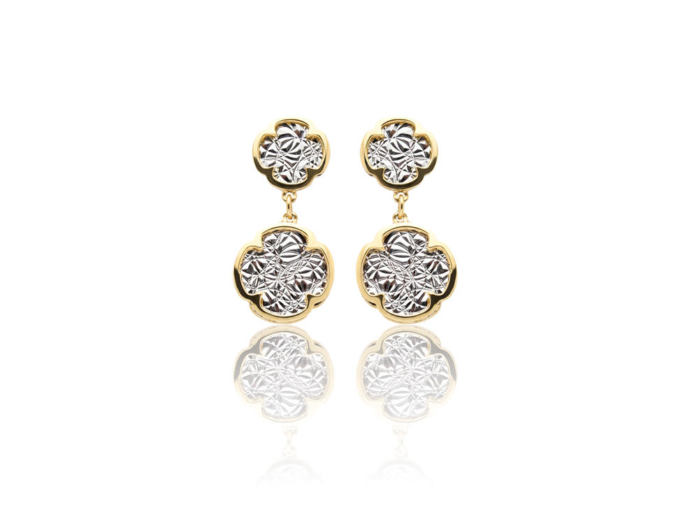 „Ove viseće minđuše od belog i žutog zlata se ističu bogatom reljefnom površinom koja im daje dubinu, karakter i savremen izraz. Kombinacija toplog žutog i belog zlata stvara skladan kontrast, dok blagi pokret pri nošenju naglašava njihovu eleganciju. Dizajnirane da budu upečetljive, a nosive, podjednako dobro prate dnevni stil kao i večernje prilike. Njihova pročišćena forma i pažljivo obrađena površina čine ih komadom koji privlači pogled, ali ostaje sofisticiran.