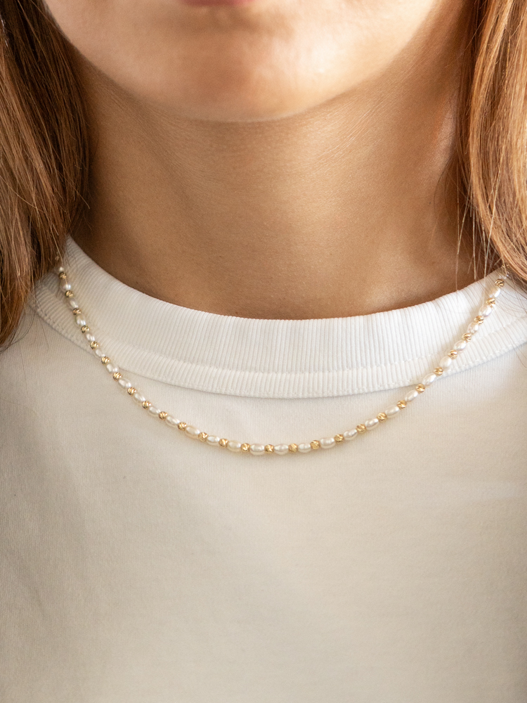 Biserna zlatna ogrlica uz koju elegancija dobija novi ritam. Niz sitnih, pažljivo biranih bisera između zlatnih kuglica pomera se uz liniju vrata, hvatajući svetlost pri svakom koraku. Diskretna, ali upečatljiva, unosi prefinjen sjaj u svaki trenutak dana.