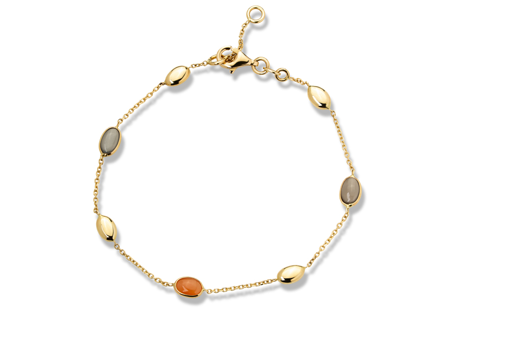 Zlatna narukvica sa sivim i narandžastim mesečevim kamenom