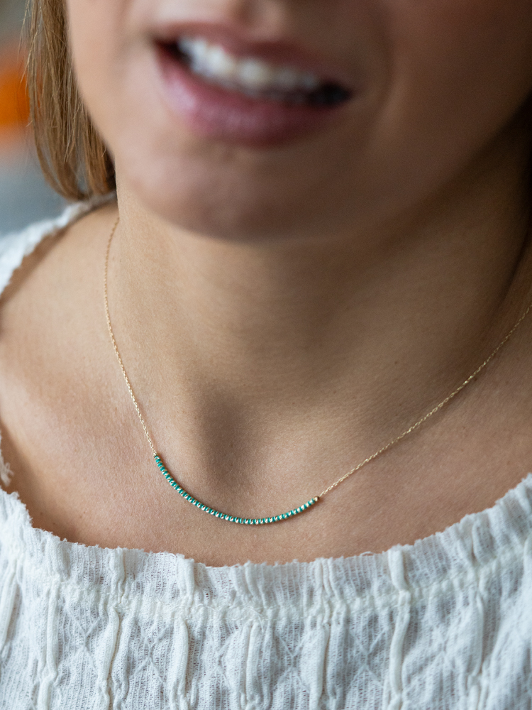 Zlatna ogrlica sa plavim emajlom, moderan, diskretan, ali upečatljiv detalj kojji osvežava svaki look. Idealna za solo nošenje ili slojevito stilizovanje sa drugim minimalističkim ogrlicama. Dostupne su viseće minđuše i narukvica istog dizajna.
