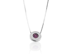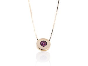 Elegantna ogrlica sa sa okruglim priveskom u čijem centru stoje rubini koji formiraju krug, kao simbol nepromenljivosti, će pružiti svim našim damama osećaj bogatstva i posebnosti.