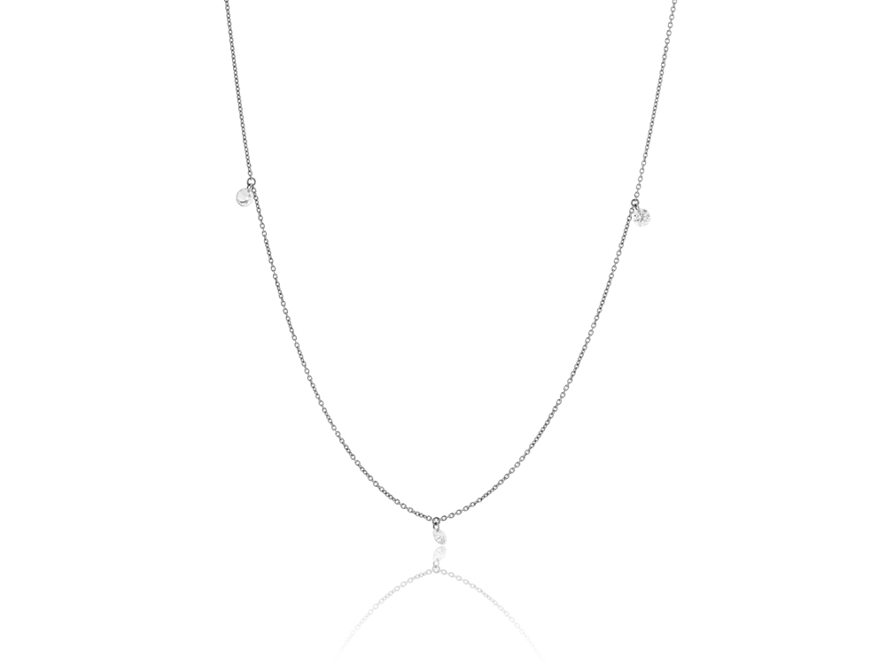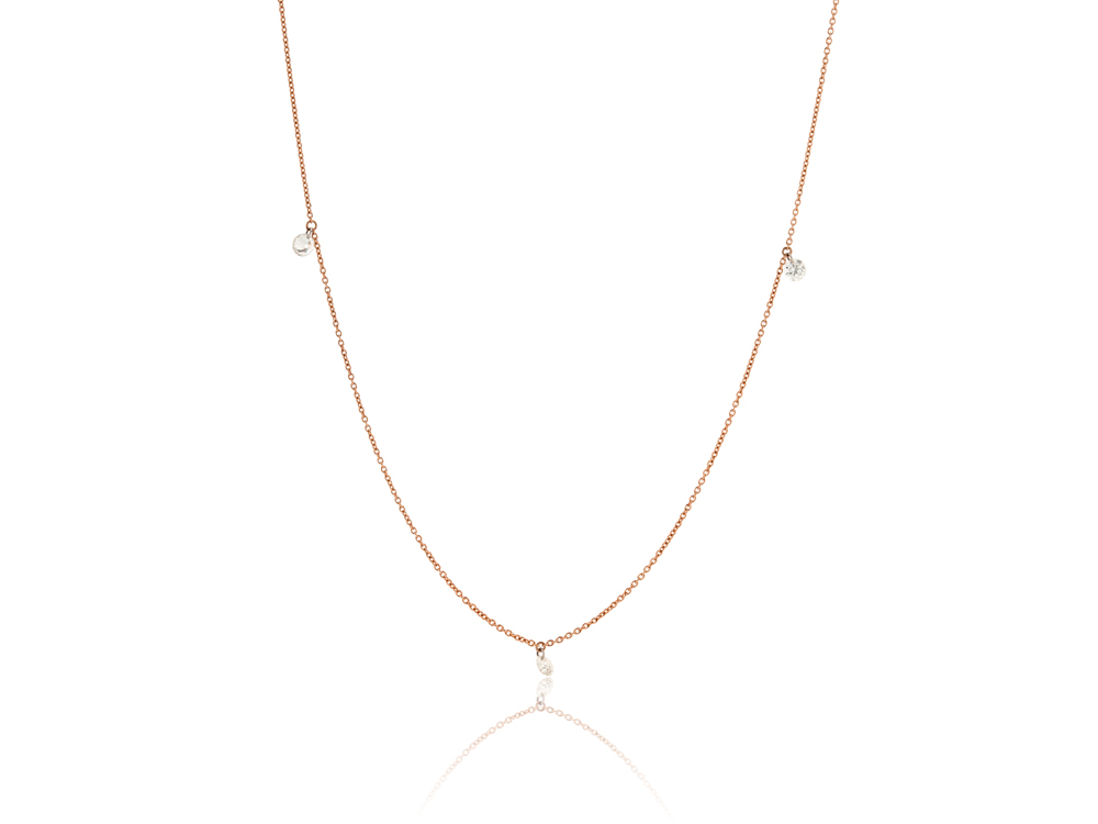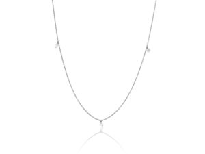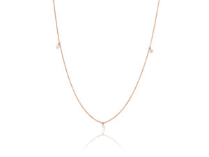 Jedan od najtraženijih dizajna savremenog dijamantskog nakita, ogrlica sa tri dijamanta nosi novu dimenziju minimalizma. Tri pažljivo probušena, okrugla dijamanta raspoređena su duž suptilnog zlatnog lančića, tako da se slobodno pomeraju i blago presavijaju pri svakom pokretu.
