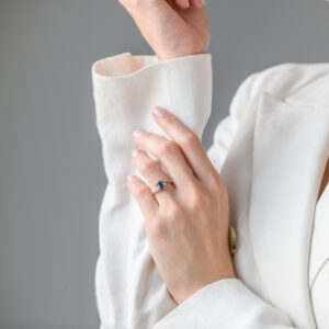 Zlatni prsten sa tri kamena simboliše prošlost, sadašnjost i budućnost. U centru stoji plavi safir a sa strane sjajni brilijanti, koji dodatno ističu lepotu ovog vrednog prirodnog kamena. Nežno uvijeni krajevi prstena daju ovom prstenu moderan i jedinstven izgled.